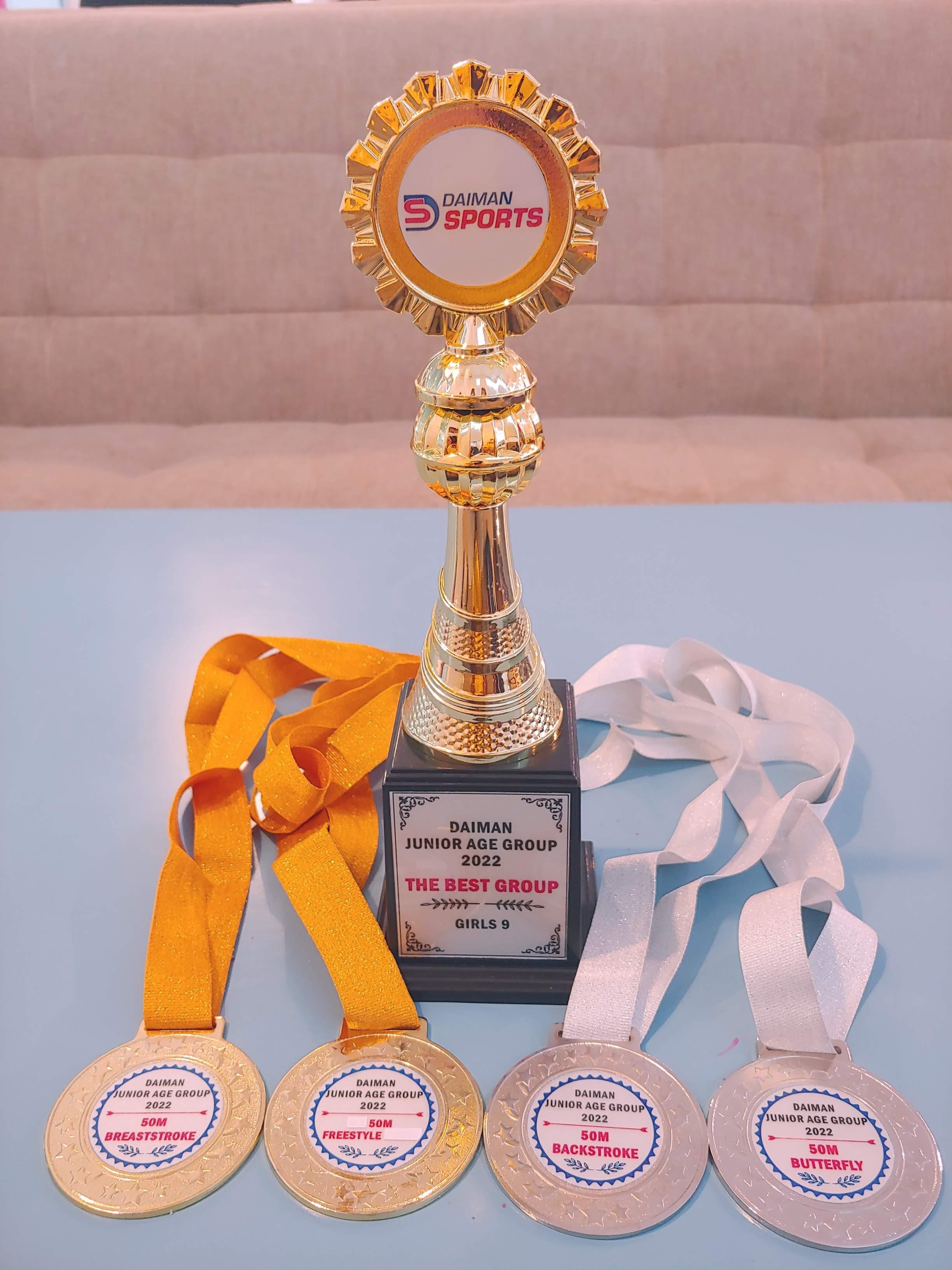 50M 평형, 자유형 금메달 / 50M 배영, 접영 은메달 / 그리고 여자 9살 그룹에서 BETS 1등 트로피를 받았습니다.