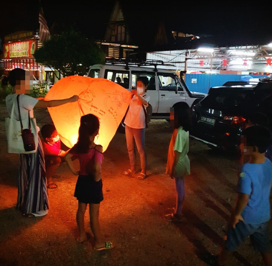 아래에서 불을 붙입니다. 그러면 뜨거운 바람이 풍등 안을 가득 채웁니다. 모양을 바로잡고 숫자 3을 카운트한 후 하늘에 날립니다.