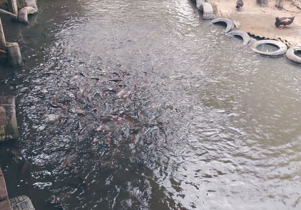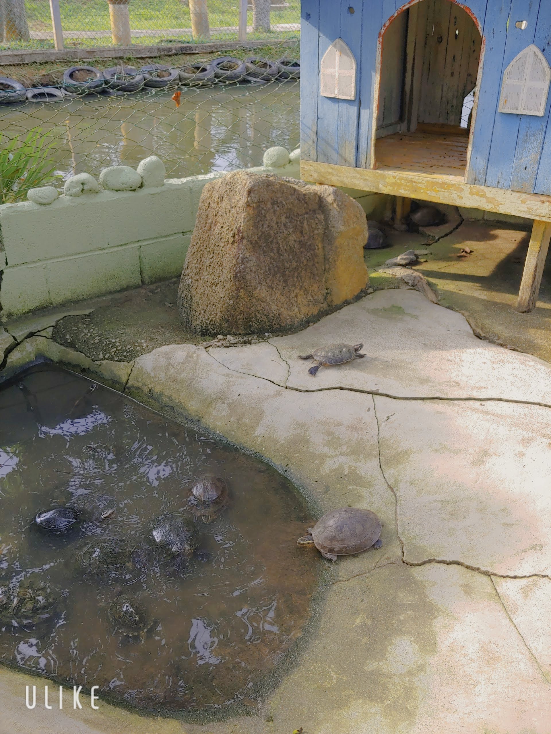 호수 안에는 큰 물고기가 많이 있고 주변으로 거북이와 새들이 거닐고 있습니다.