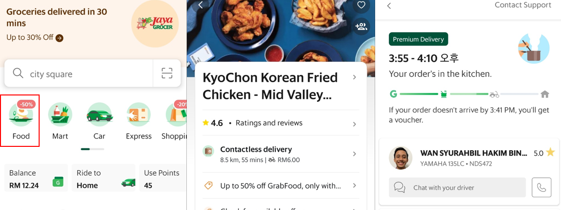 Mart : 간단한 장보기를 할 수 있습니다. Jaya Grocer 부터 Hero market 등 큰 슈퍼마켓 부터 Guardian, Watsons같은 약국이나 잡화상점등에서도 주문을 할 수 있습니다.