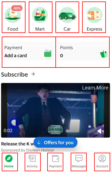 Account : 나의 포인트나 이벤트 내용을 확인할 수 있습니다. 헬프 센터에서 그랩 관련 문제가 있을 시 도움을 받을 수 있습니다.