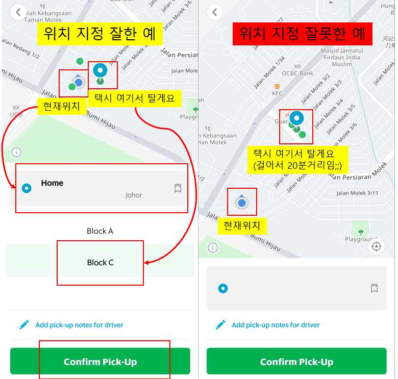만약 잘못된 위치에 선택 된뒤 그랩을 부르게 되면 대 혼란이 일어납니다. 그랩 택시기사는 정해진 곳으로 올 것이니까요. 항상 택시가 올때까지 긴장을 하고 있는 것이 (?) 좋습니다.