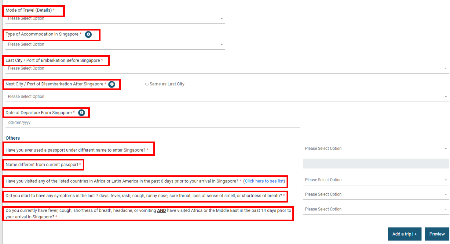 * Have you visited Africa or Panama or South America (except Chile) inthe past 6 days prior to your arrival in Singapore? : 싱가포르 입국 6일 전에 아프리카, 파나마, 남미를 방문한 적이 있는가?