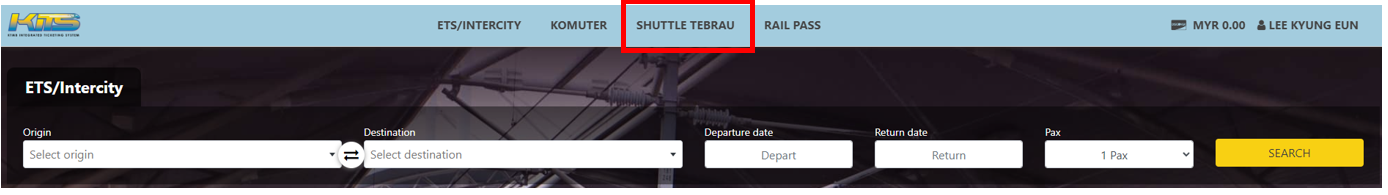 로그인하면 ETS.INTERCITY 탭으로 자동으로 돌아가는데, 우리는 SHUTTLE TEBRAU 탭에서 진행합니다.