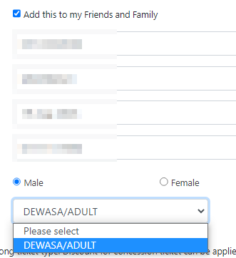 어른과 아이 모두 5링깃으로 동일함으로 DEWASA (말레이어로 성인) / ADULT 로 설정하시면 됩니다.