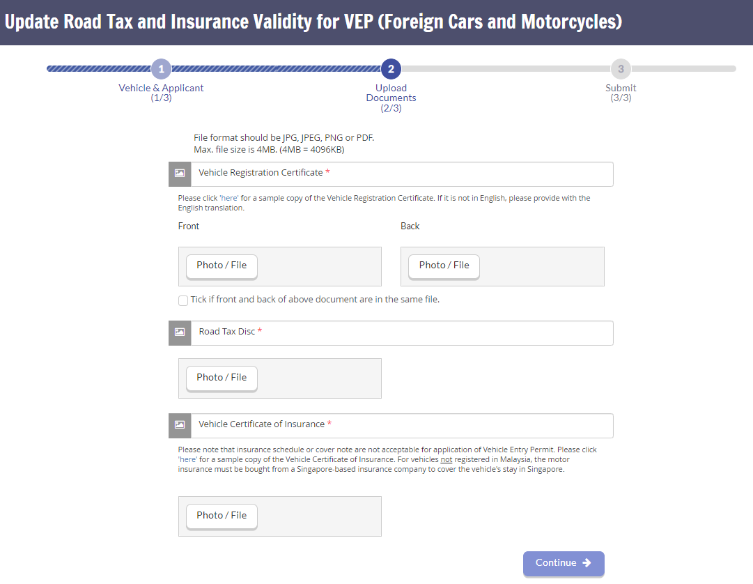 Extension of stay in Singapore VEPs have a validity period of 14 days. To extend your vehicle's stay in Singapore, you will need to renew your VEP. The 14-day VEP validity period will start on the date of the vehicle's entry into Singapore, and thereafter