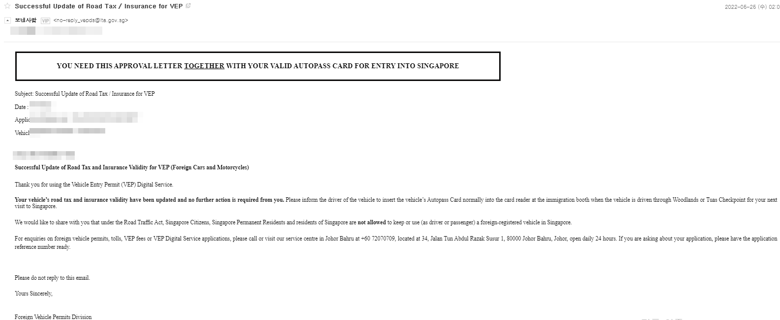 7. 승인이 완료되면 이메일로 승인 이메일이 옵니다. 이 내용이 적힌 페이지를 프린트하여 싱가포르에 입국할때마다 가지고 다니셔야 합니다.