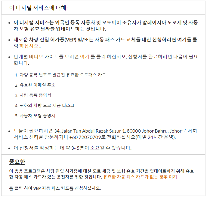 조호바루에서 싱가포르로 자가용을 이용할 경우 필요한 VEP 라는 서류가 필요합니다.