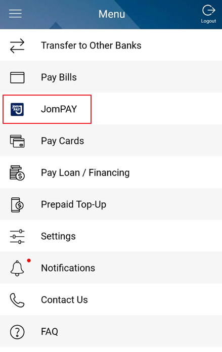 그러면 Menu 화면이 열리고 JomPAY 버튼을 터치하여 나머지 정보를 입력하면 됩니다.