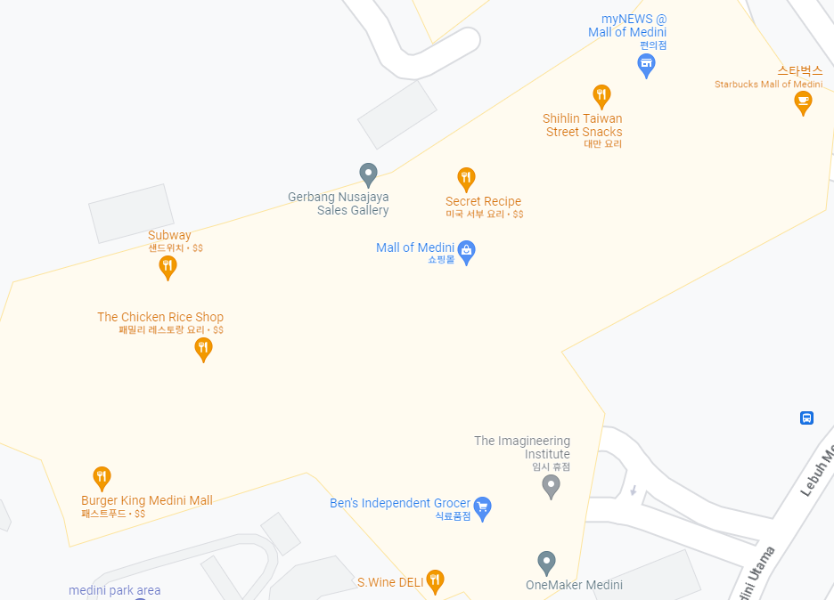 가볼 만한 식당으로는 메디니 몰 안에 있는 KFC, Burger King, The Chicken Rice Shop, Subwa, Secret Recipe, Shihlin Taiwan Street Snacks 가 있고 Starbucks에서 커피를 마실 수 있습니다.