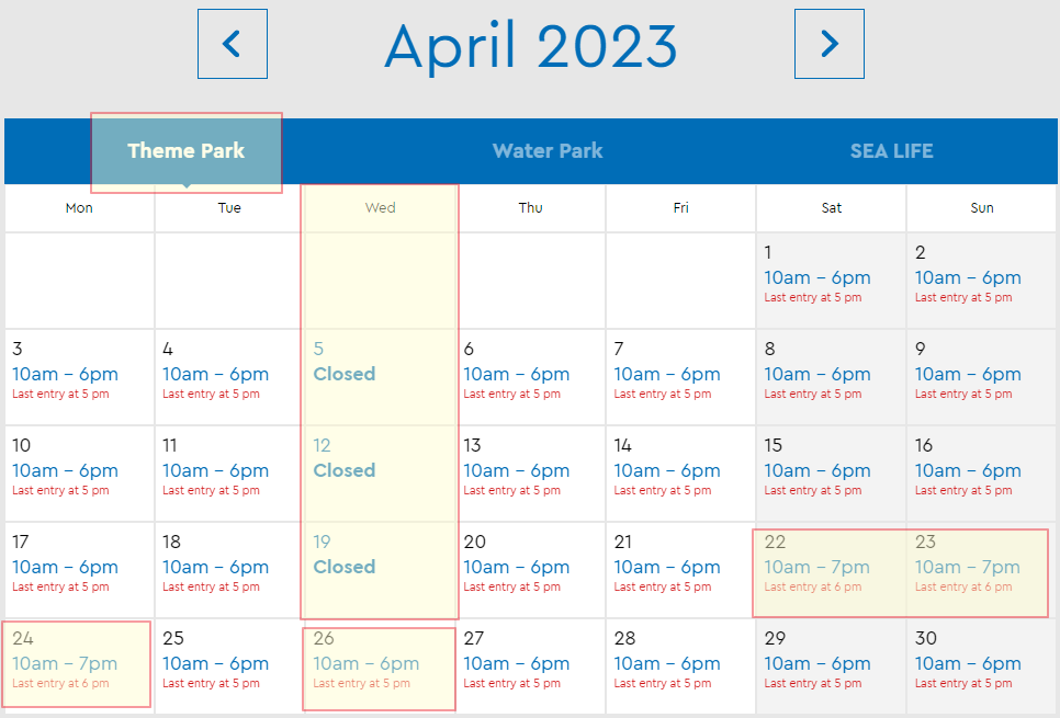 Theme Park(놀이동산)를 클릭하고 보니, 놀이동산은 수요일마다 쉬는 날입니다.