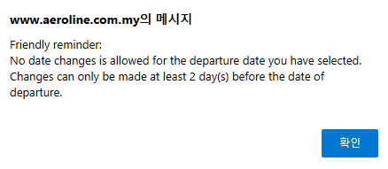 팝업창 메시지에 의하면, '선택한 출발 날짜에는 날짜 변경이 허용되지 않는다'라고 하네요. 출발 날짜 최소 2일 전에만 변경할 수 있다고 합니다. 아마 제가 선택한 날짜가 오늘이라서 저런 메시지가 뜨는 것 같습니다. 출발 2일 전에는 날짜 수정이 가능하니 참고하시면 됩니다.